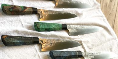 Beautiful hand forged Damascus blades forged and folded layer upon layer to make intricate patterned steel blades