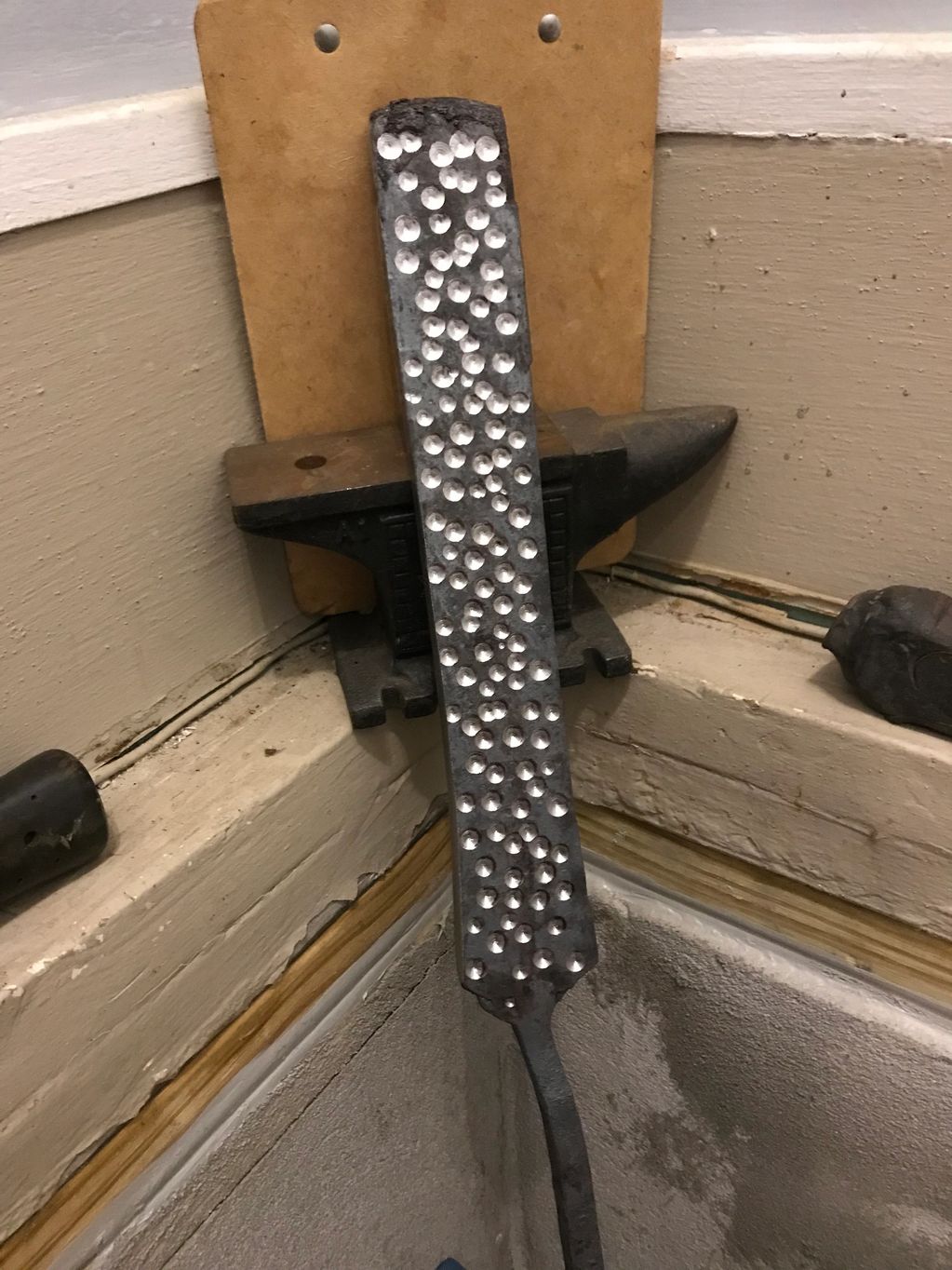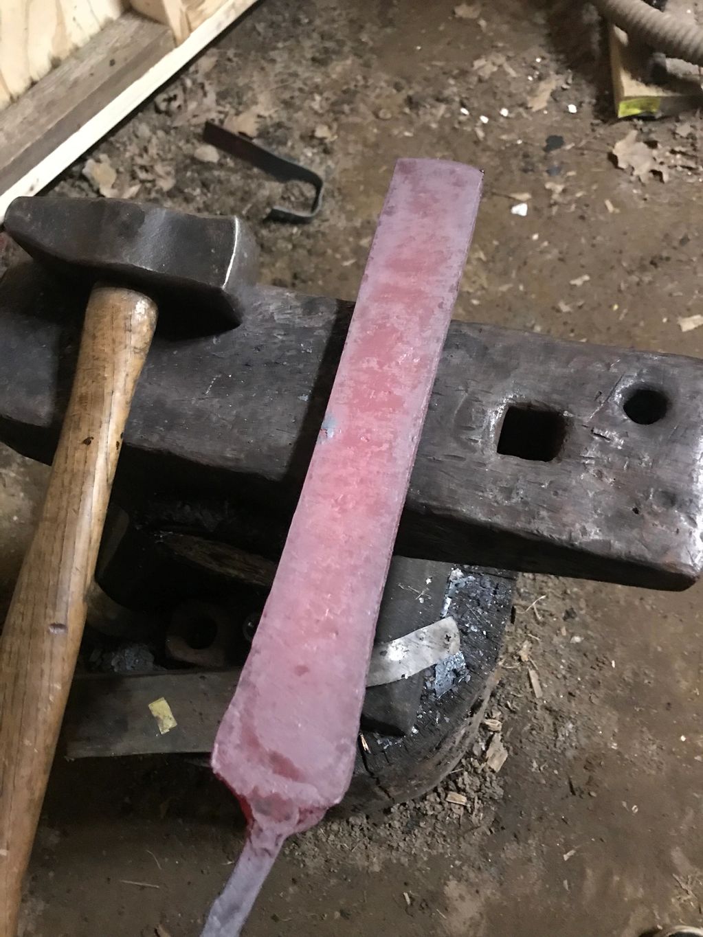 This is a bit out of order, but this is a Damascus billet that has been forge welded, drawn out, cut and restacked, forge welded again, and drawn out. This has been "dimpled" with a drill to expose more layers and bring them up to the surface as "raindrops" this is.then forged flat, and shaped into the final blade profile