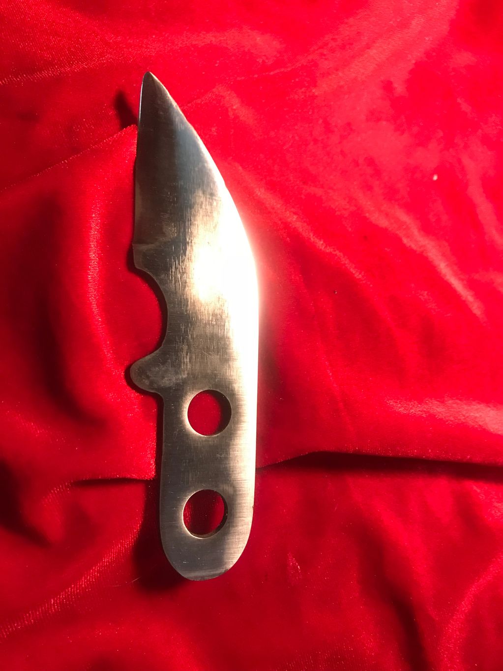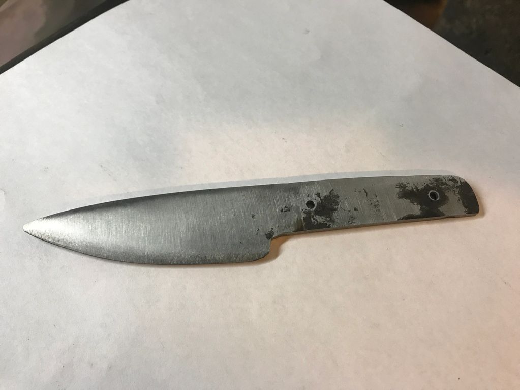 Small utility/hunter in 1095 high carbon steel. Just heat treated, and ready for handle scales, and final grinding. Send me a comment if you're interested, and would like input on wood selection!